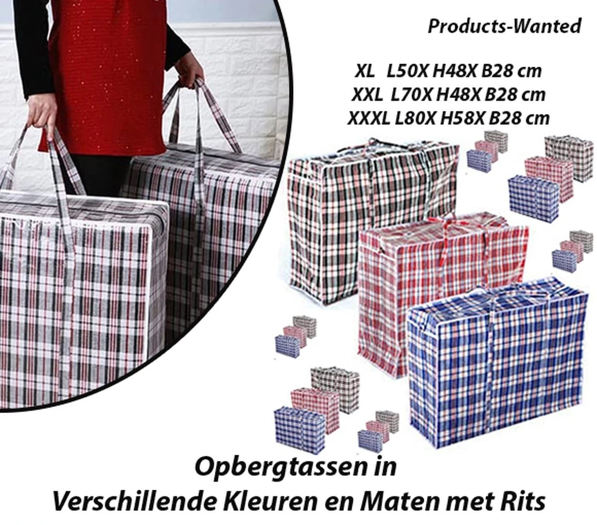 Highlights: * 10-Stuks XXL Verhuistassen en Reistassen in Verschillende Kleuren met Rits * Gemaakt van stevig polypropyleen, vochtdicht en bijna niet kapot te krijgen * Veelzijdig te gebruiken als boodschappen, opberg of reistas * Multifunctioneel * Geweldige oplossing voor het opbergen van kerstdecoraties, kerstboom, dekbedden, handdoeken, speelgoed, winterkleding en reserveonderdelen, gordijnen, kussens, babykleding, sporttoestellen, laundry bag en extra opbergmogelijkheden voor de keuken of als onderbed * Sterk en duurzaam * Handig in gebruik * Opvouwbaar * Waterafstotend * Lichtgewicht * Geweven plastic PVC * Mix kleuren geleverd (zwart, blauw en rood ) * L70X H48X B28 cm XXL105 Liter Met deze tassen kun je echt van alles. Je kunt er een grote boodschap mee doen. Winterkleding, gordijnen, winterdekens, kussens, handdoeken, kampeerspullen, slaapzakken en nog veel meer opbergen of verhuizen. Je kunt de tas gemakkelijk achterin de auto zetten als je op vakantie gaat. Met de stevige ritssluiting is de tas goed af te sluiten en zitten je spullen goed opgeborgen. Eenvoudig op te bergen en kan probleemloos worden gebruikt als opbergtas met ritssluiting onder het bed, in een kledingkast, zolder, garage of bergruimte, als opbergbox voor kleding en schoenen onder het bed en dankzij de comfortabele lange handgrepen kan hij gemakkelijk als grote boodschappentas worden opgevouwen voor grote boodschappen