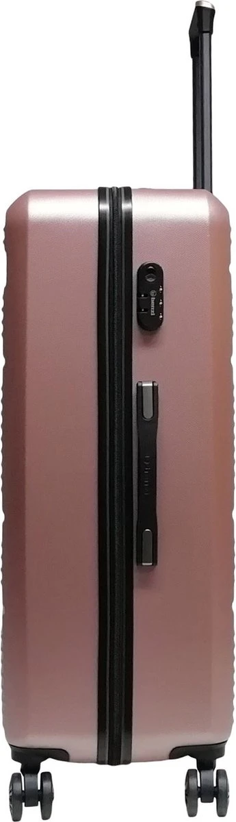 Grote hardschalen koffer van het merk Benzi. De koffer is voorzien van een ritssluiting rondom die op slot te zetten is middels een vast cijferslot op de zijkant van de koffer. Binnenin gevoerd, spanbanden en tussenschot met ritssluiting. Op het tussenschot zit een ritsvak en twee steekvakken voor het overzichtelijk opbergen van kleine reisaccessoires.