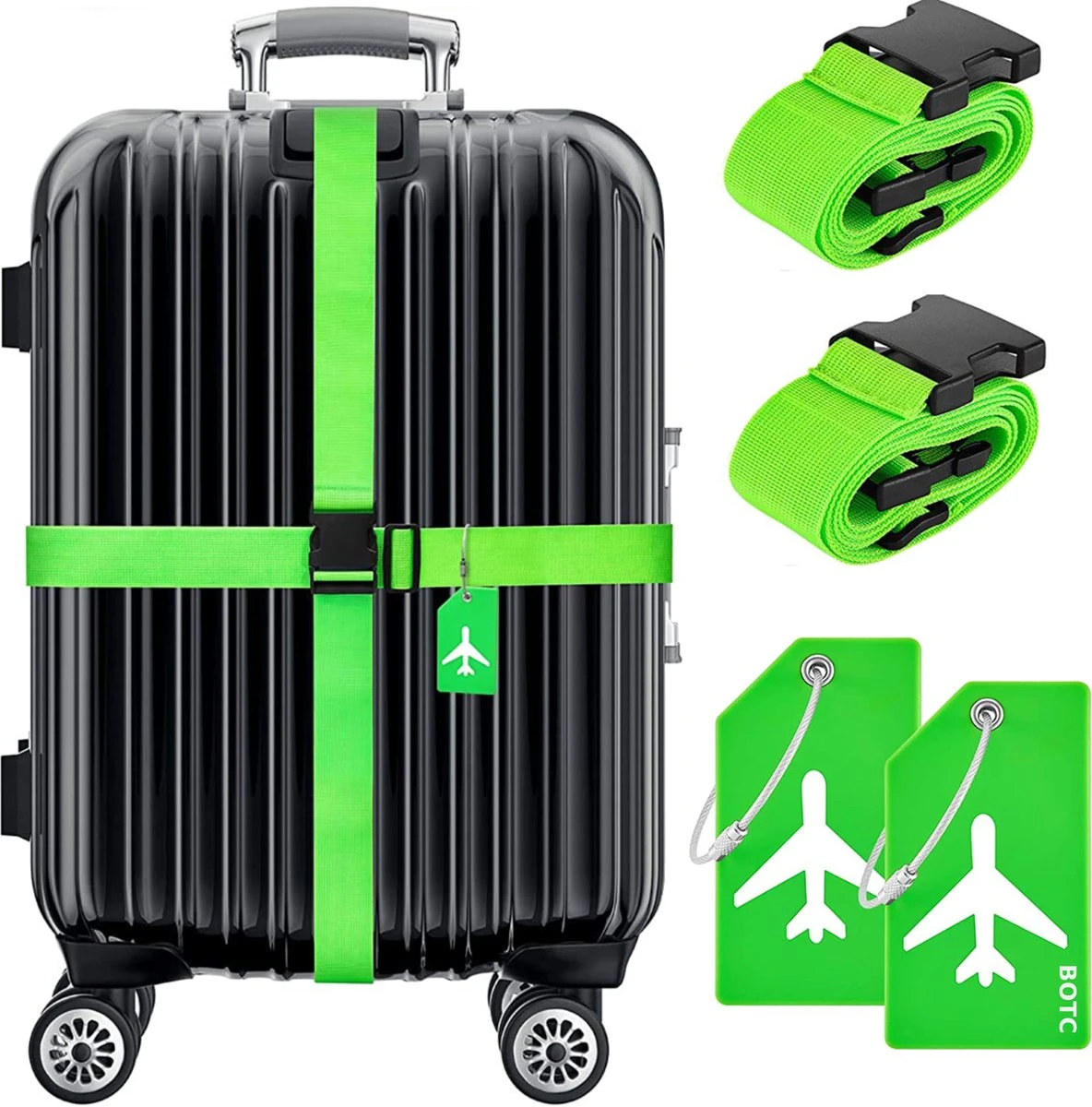 BOTC Kofferriem – 4 stuks – 2 Bagagebanden + 2 bagagelabels – 188 cm * 5 cm – Bagage Riem – Bagageband – Verstelbaar – Groen、