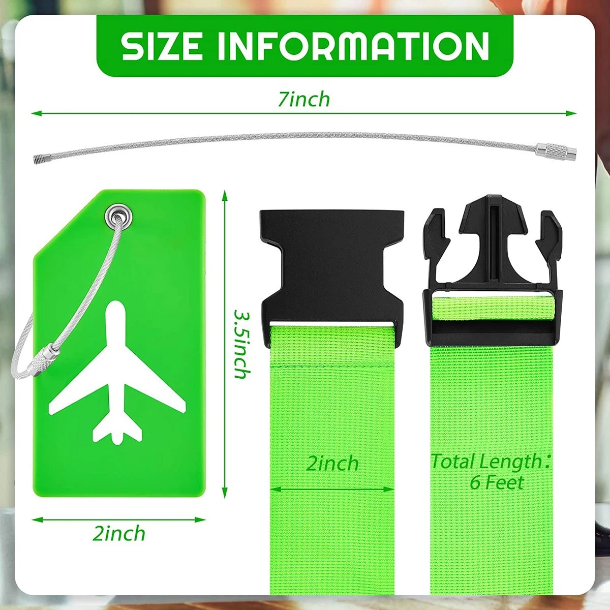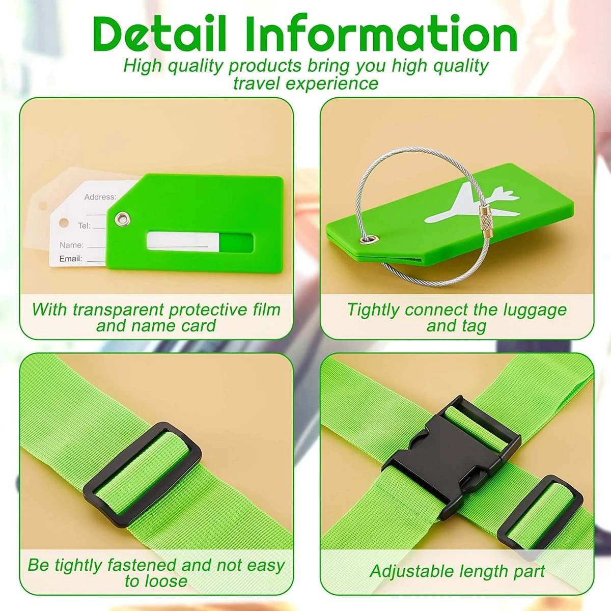Doordacht Ontwerp: u kunt uw informatie rechtstreeks op de kaart met een pen schrijven, geen behoefte om zich ongerust te maken over dat uw persoonlijke informatie zal peeped aangezien de helft van de bagagelabel uw details goed zal verbergen; De riemen van de bagagetoebehoren kunnen een kracht tot 400 ponden weerstaan, die de veiligheid van uw bagage zal verzekeren. De set bagageriem en kofferlabels is een geschenk voor familie, vrienden en ouderen die graag reizen of uitgaan.