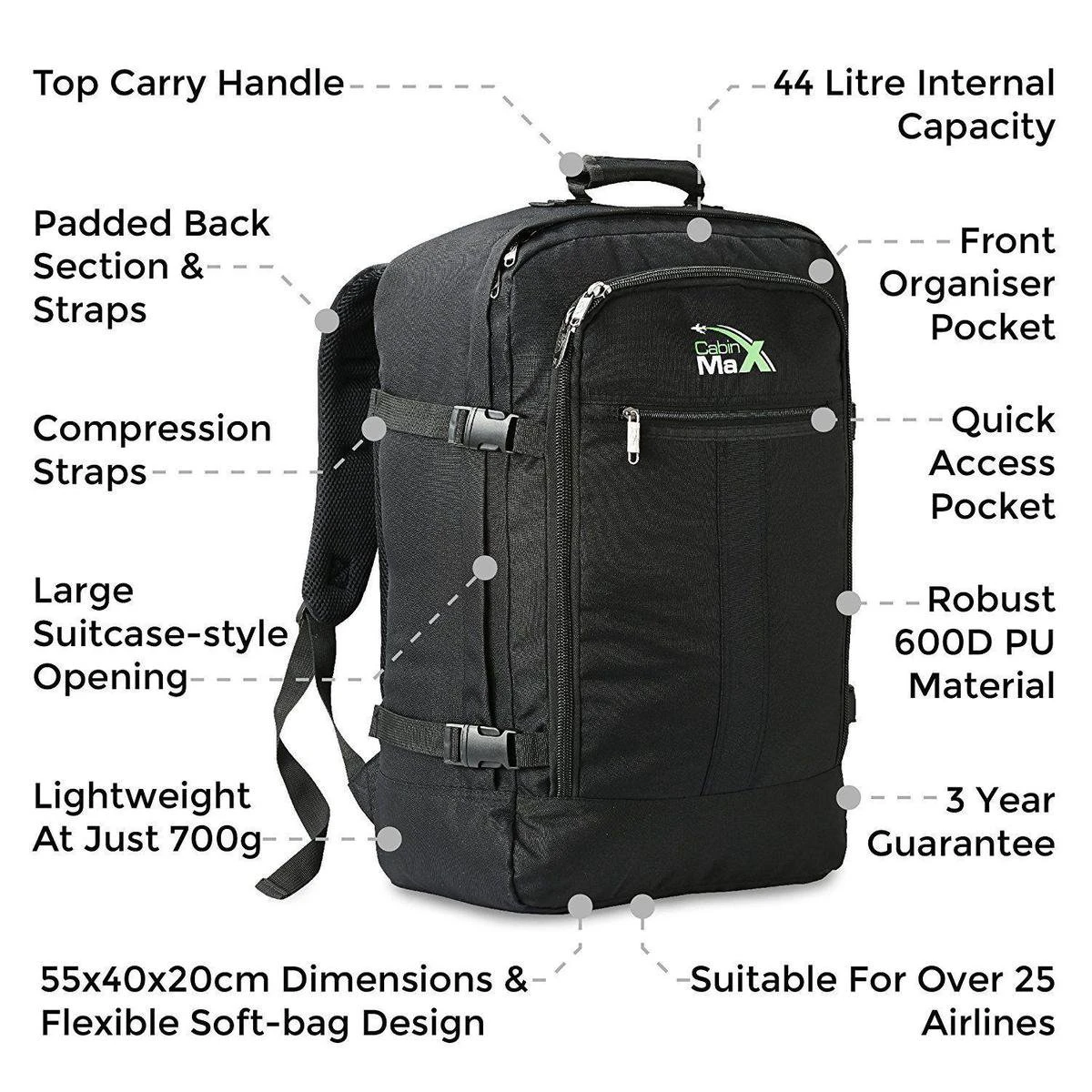 CabinMax Metz Reistas– Handbagage 44L- Rugzak – Schooltas – Backpack 55x40x20cm – Lichtgewicht – Zwart/Donkerblauw (MZ BK) (MZ BK/NY)