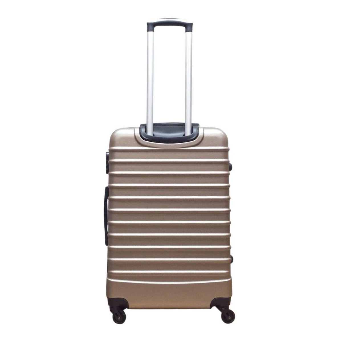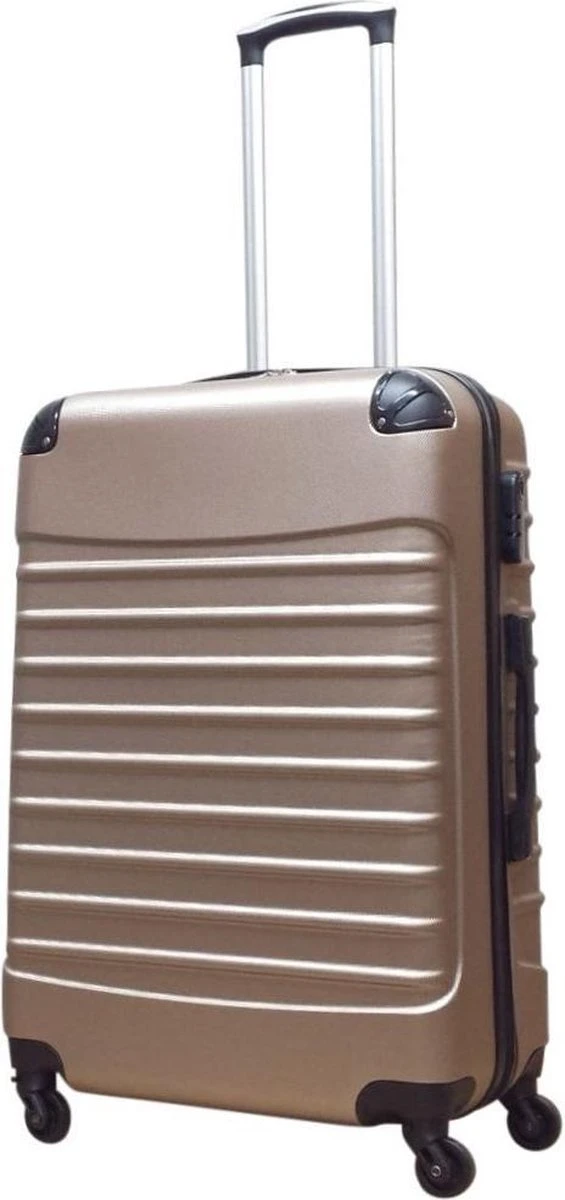 Grote ABS hardschalen koffer in kleur champagne. Koffer is voorzien van een ritssluiting rondom. Binnenin gevoerd en voorzien van tussenschot met ritssluiting en spanbanden. Koffer is op slot te zetten middels een vast cijferslot op de zijkant van de koffer. Handvat op bovenkant en zijkant en voorzien van een comfortabel 4-wiel systeem.