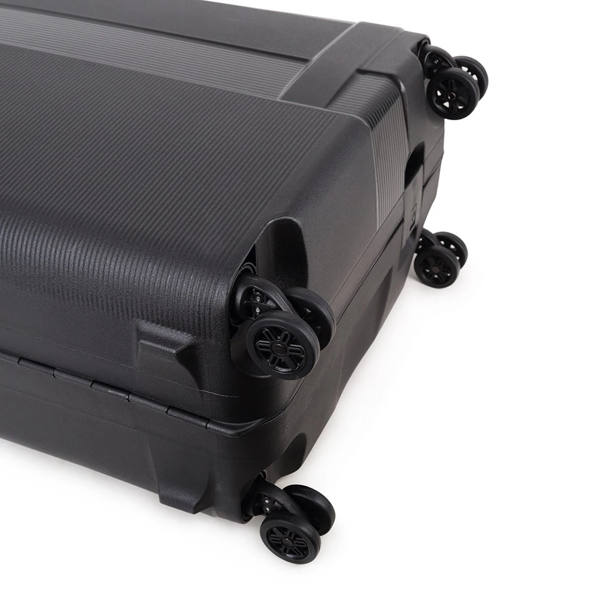 Grote polypropyleen hardschalen koffer uit de Transit serie van het merk Decent. De koffer is rondom voorzien van drie kliksloten. Op de boven-en onderkant zitten sloten die u vastklikt en op de zijkant zit het hoofdslot dat een TSA cijferslot is. De koffer heeft een zwarte voering, een tussenschot met rits, een extra ritsvak en is voorzien van spanbanden. Handvat op bovenkant en zijkant en voorzien van een comfortabel dubbel 4-wiel systeem.