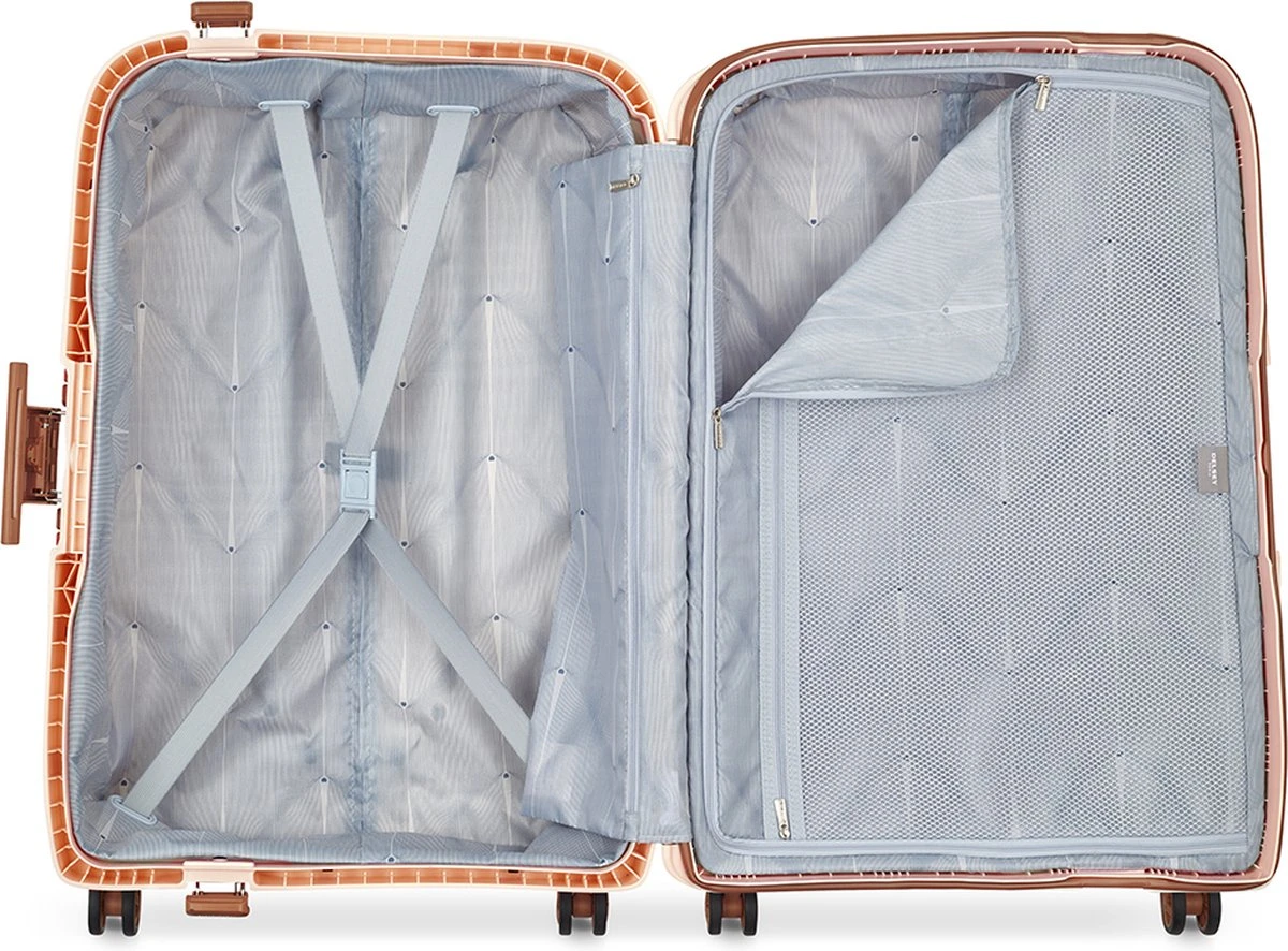 Middenmaat spinner uit de vernieuwde Moncey serie van Delsey. De Delsey Moncey koffer biedt alles wat een moderne koffer nodig heeft. De schaal is gemaakt van polypropyleen en is naast zeer sterk ook relatief licht. Voorzien van een veilig driepuntssluiting Ên een TSA-combinatieslot voor zorgeloos reizen van en naar de VS. Het interieur is volledig gevoerd en praktisch ingericht met een tussenschot en inpakriemen. Zeer gemakkelijk mee te nemen met 4 stille wielen en verstelbare trekstang. De schaal is zeer waterafstotend en door een speciale strip is hij waterproof.
