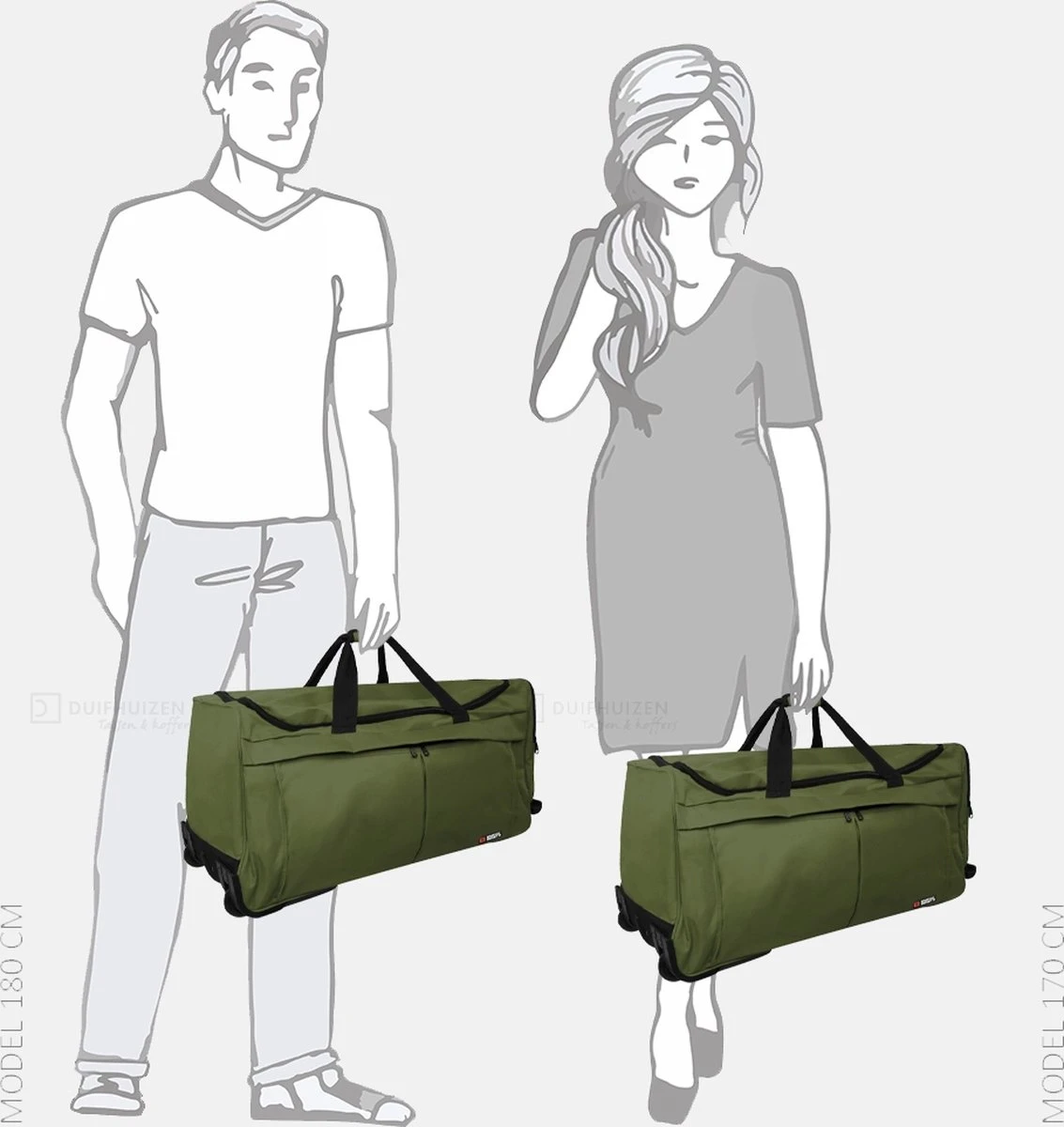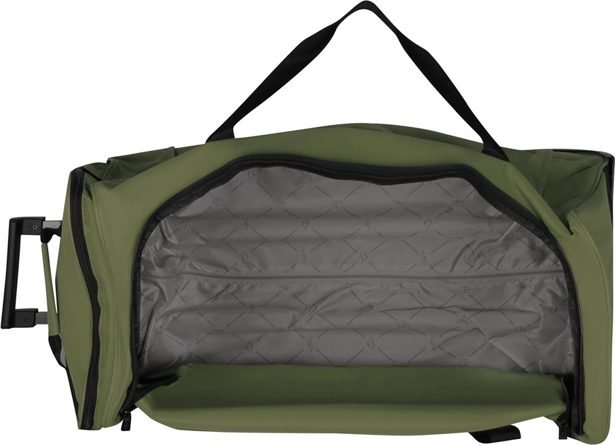 De tas heeft een volledig verstevigde bodemplaat met kunststof beschermstukken op de bodem en de zijkant, waardoor de tas zeer stevig is en ook op de zijkant rechtop kan worden gezet. De reistas heeft twee wielen en een uitschuifbare trekstang.