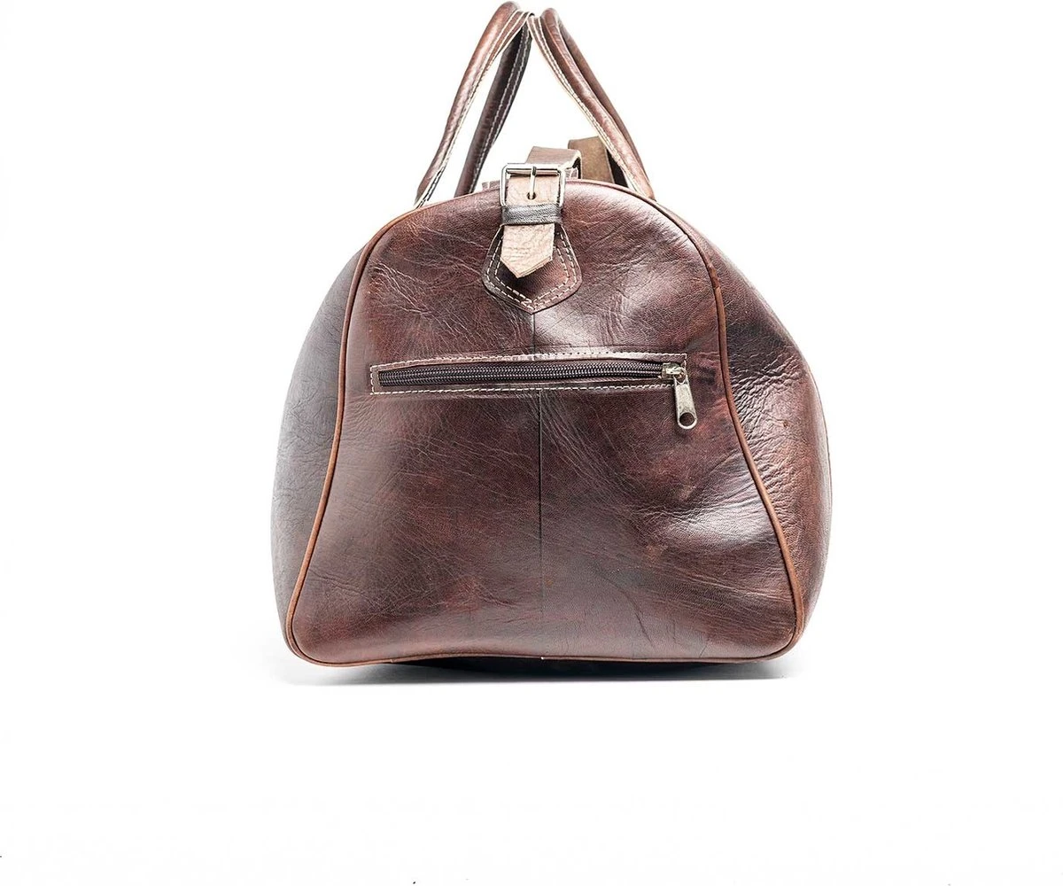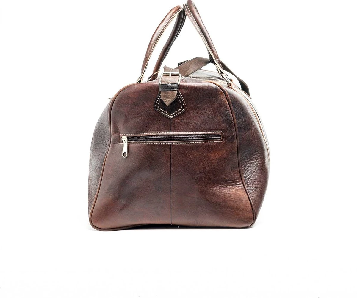 Deze grote leren bruine weekendtas is ideaal voor een weekend of weekje weg. Reis in stijl met deze luxe hand gestikte traveller. Het hoofdvak heeft een grote rits, hierdoor kan de tas helemaal open en kunt u gemakkelijk bij uw spullen. Daarnaast heeft de tas nog twee vakken met een handige rits zodat u uw paspoort of andere kleinere items gemakkelijk kan opbergen en snel bij de hand heeft. U kunt de tas dragen met de 2 handvatten op de bovenzijde of met de lange verstelbare en afneembare schouderband. De tas is 53 x 33 x 28 cm en heeft een literinhoud van 50 liter. Reis stijlvol en gemakkelijk met deze hand gestikte weekendtas gemaakt van echt koeienleer! Komt in de leerkleuren cognac, bruin en zwart. Kijk ook eens naar de andere musthaves van Studs & Stones!