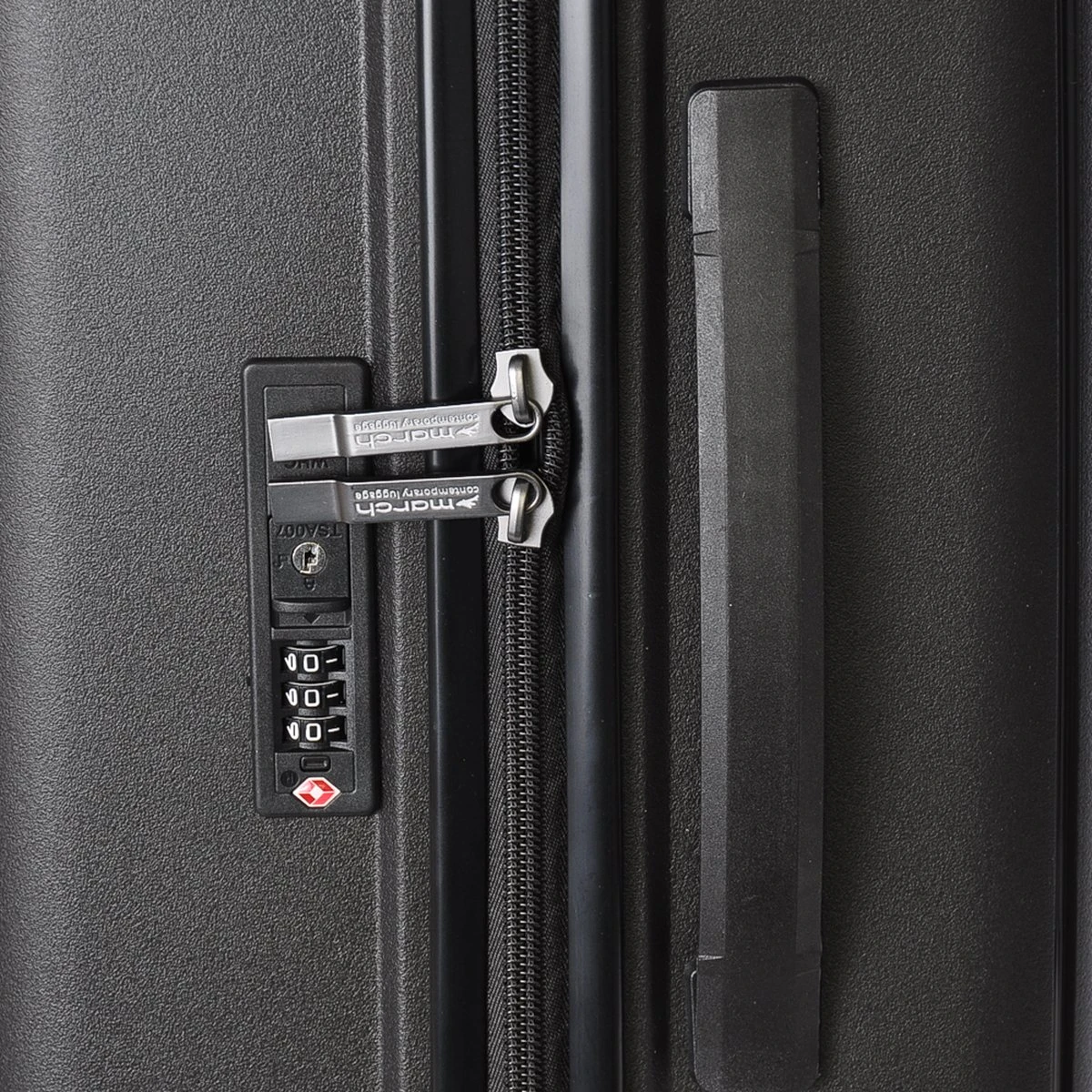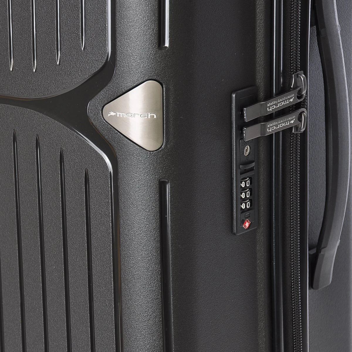 Moderne middenmaat koffer uit de Ready To Go serie van March. Deze stijlvolle collectie van March is geheel vervaardigd uit extra lichtgewicht 100% polypropyleen. Dit speciale polypropyleen is flexibel en kan tegen zeer veel stootkracht tijdens een reis waardoor je koffer praktisch onbreekbaar is. De koffer is voorzien van een subtiel vlak weggewerkt TSA-combinatieslot aan de zijkant van de koffer. Dankzij de vier soepele dubbele extra stille wielen en dubbele trekstang is de koffer makkelijk mee te nemen. Aan de bovenzijde bevindt zich een stevig handvat. In het gevoerde interieur is een praktische indeling te vinden. De koffer is namelijk voorzien van gekruiste inpakriemen en een tussenschot, afsluitbaar middels een rits met daarop een groot ritsvak. Het logo van March is van mooi mat metaal en verwerkt in het midden van de koffer. Alle onderdelen zijn in dezelfde kleur van de schaal van de koffer wat het een luxe uitstraling geeft. Met een March Ready To Go heb je een prachtige koffer die jarenlang je reisgezel kan zijn.