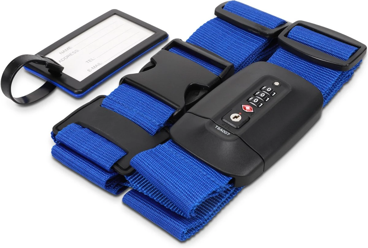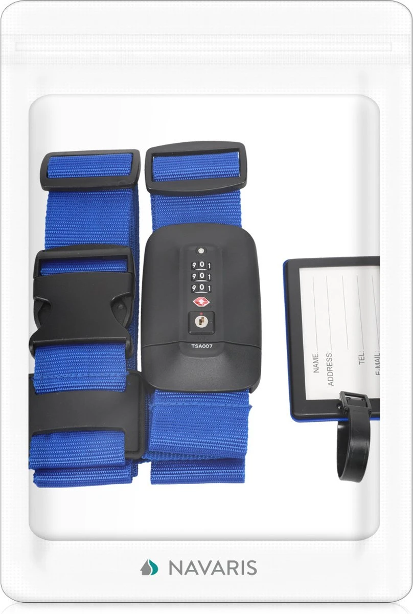 Neem je bagage veilig mee op reis met de Navaris kofferriem met TSA cijferslot en adreslabel.