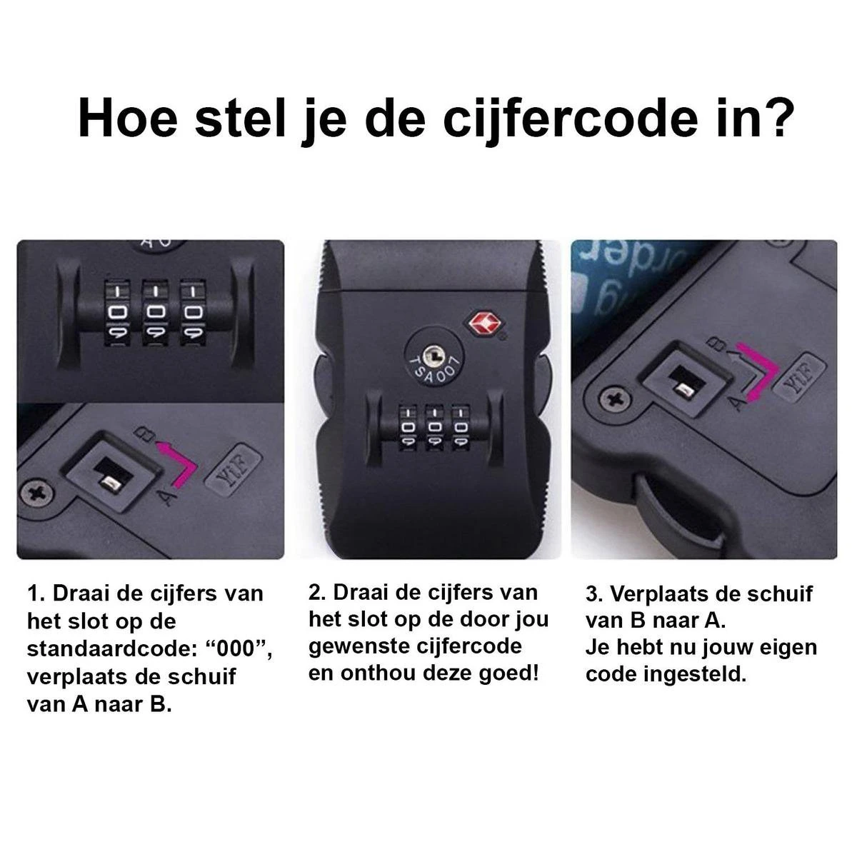De kofferriem kan worden afgesloten door middel van een 3-cijferig TSA codeslot. Deze is binnen een handomdraai ingesteld met behulp van de bijgeleverde instructies. De kofferriem is geschikt voor officiele TSA inspecties en beschikt over een officieel TSA certificaat.