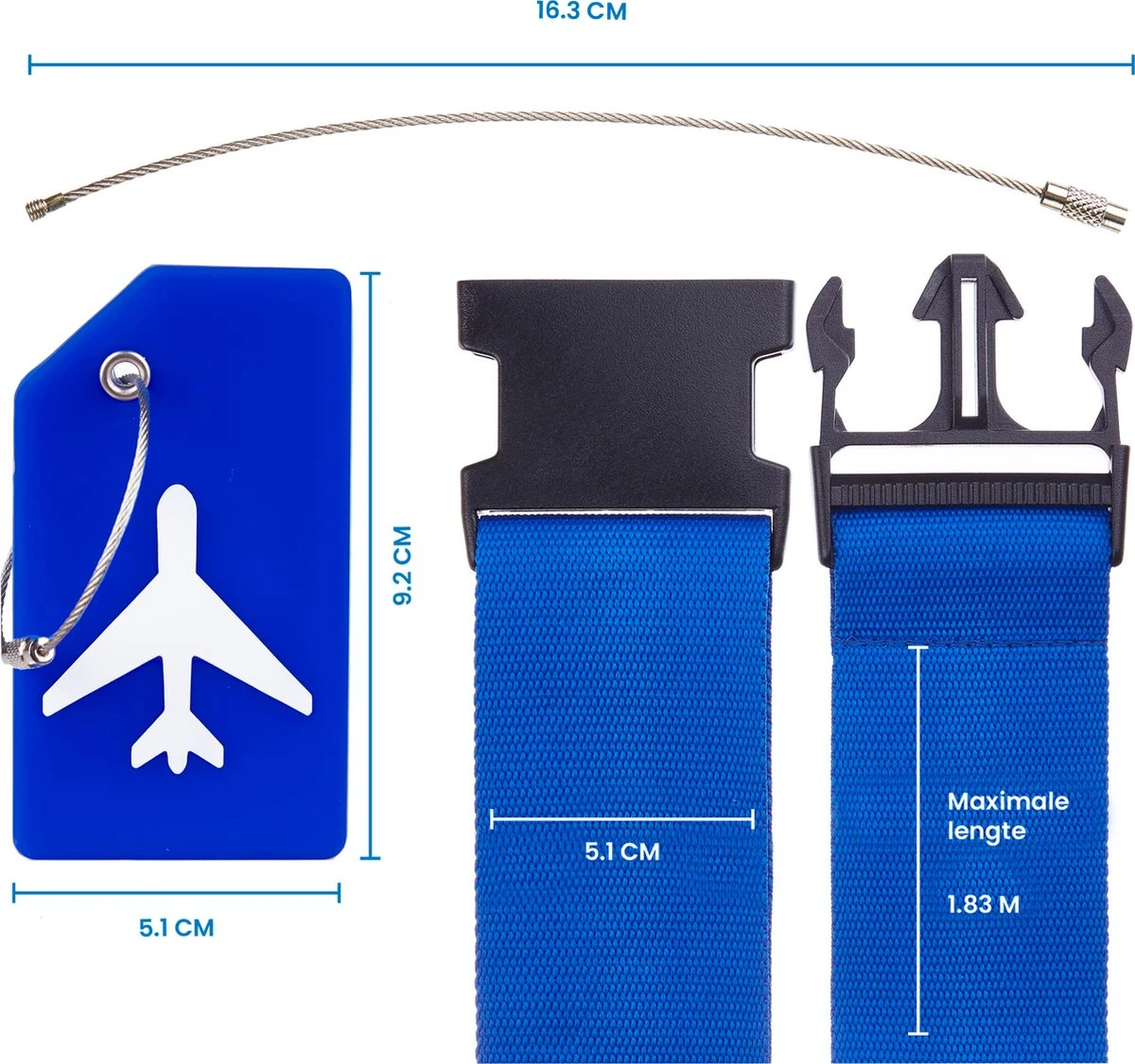 YONO Kofferriem Met Kofferlabel – 2 Kofferband En 2 Bagagelabel – Dubbele Bagage Riem Verstelbaar – 4 Pack – Blauw